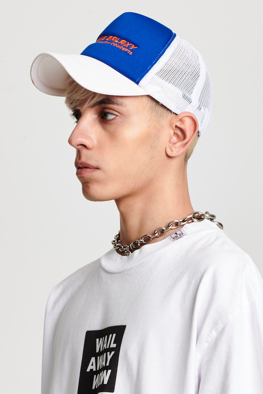 ROYAL BLUE FRONT WHITE MESH EMBROIDERED LOGO TRUCKER HAT